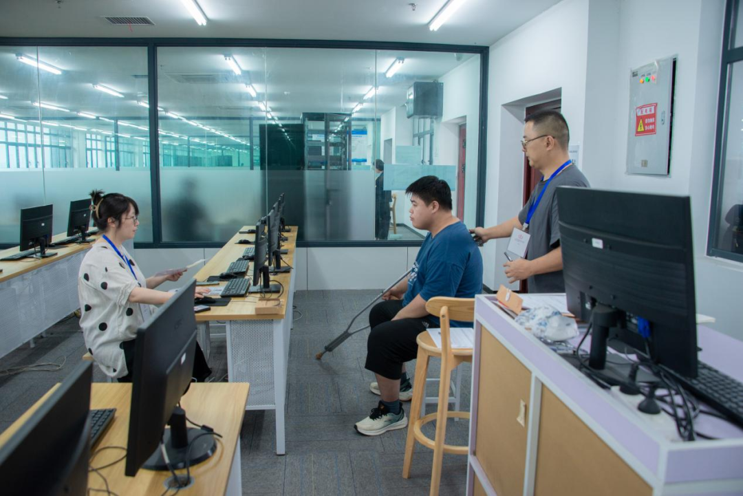 文华学院考点一名视障考生在工作人员的暖心护航下安心应考。该考生一眼无视力、另一眼视力仅0.1,无法正常阅读考试机试题。市司法局提前为她提供辅助放大设备,安排专人全程陪同。从入场开始,工作人员小心搀扶其进入考场,耐心引导走向座位;午休期间,还贴心为她准备了温热的午餐和饮品。考试结束后,该考生感动地表示:“他们像家人一样照顾我,让我能安心考试,真的太感谢了!”(经本人许可同意出镜)