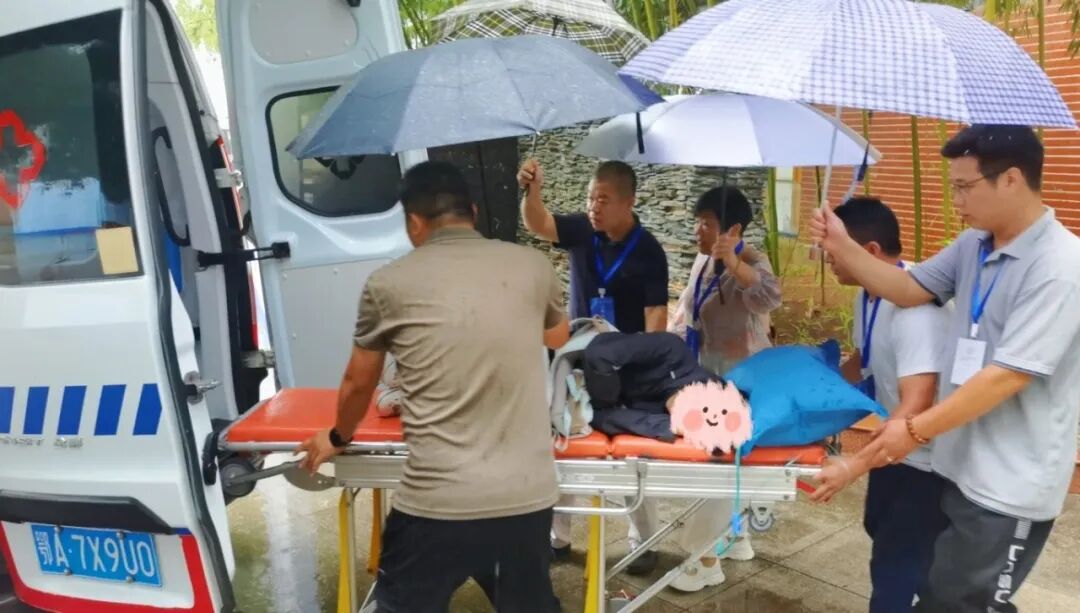 9月14日,武汉软件工程职业学院考点的一位考生突发身体不适。医护人员第一时间赶到现场,采取急救措施,迅速将该考生用担架从考场所在的五楼抬到一楼。此时室外倾盆大雨,工作人员冒雨为考生撑伞,将其送入救护车前往医院救治,整个救治过程高效有序。