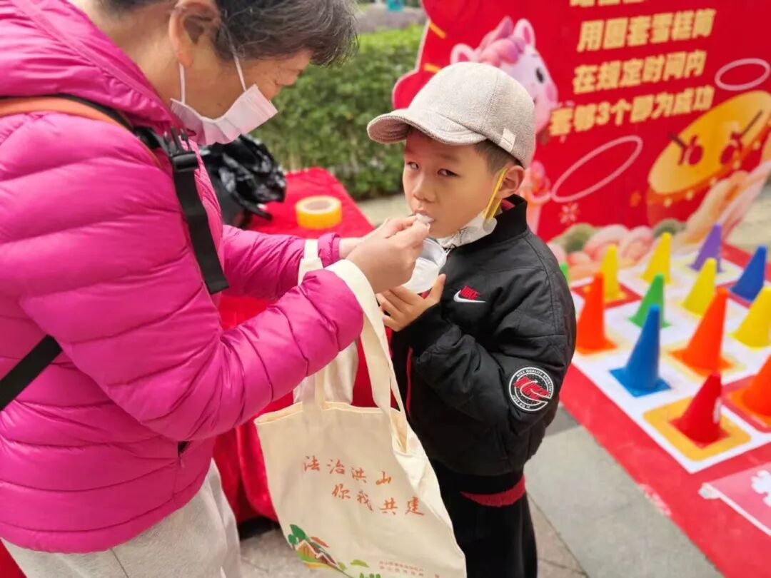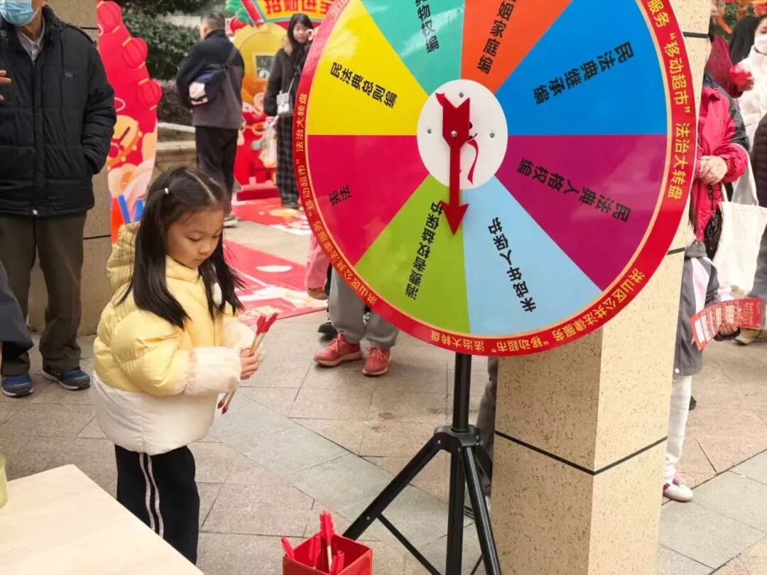 “中了!中了!”不远处传来阵阵欢呼。法治套圈、趣味投壶、普法大转盘……互动游戏区,传统游艺项目被注入“法治基因”,瞬间点燃了全场的热情。孩子们围着游戏区跃跃欲试,老人们也笑呵呵地加入挑战。每完成一个游戏,就能收获一份普法小礼品,法律知识问答穿插其间,真正让普法宣传从“纸面”走向“地面”。